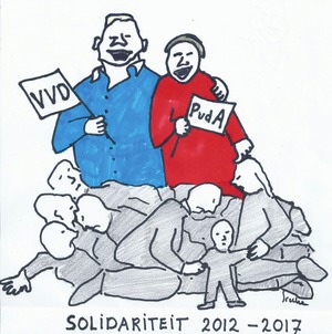 Daarna was het de PvdA die, bij monde van fractievoorzitter Samsom en vooral ook de staatssecretarissen Klijnsma en van Rijn, die het ronduit asociale kabinetsbeleid uitdroegen en dat met enthousiasme deden. Vier jaar lang! De VVD had zich geen betere, geen trouwere coalitiepartner kunnen wensen. De PvdA voerde zichzelf op als mede-architect van de ingrepen in de sociale zekerheid, van de transities naar de gemeenten, van de ingrepen in de zorg voor ouderen, zieken en gehandicapten, in de jeugdzorg, van de zware bezuinigingen, van het in feite afschaffen van het recht op zorg. Als de mede-ontwerper van de zelfredzaamheid, van de terugtredende overheid op sociaal gebied, van de verbouwing van sociaal Nederland, ook wel ‘hervormingen’ genoemd.